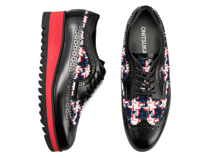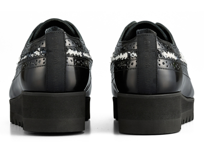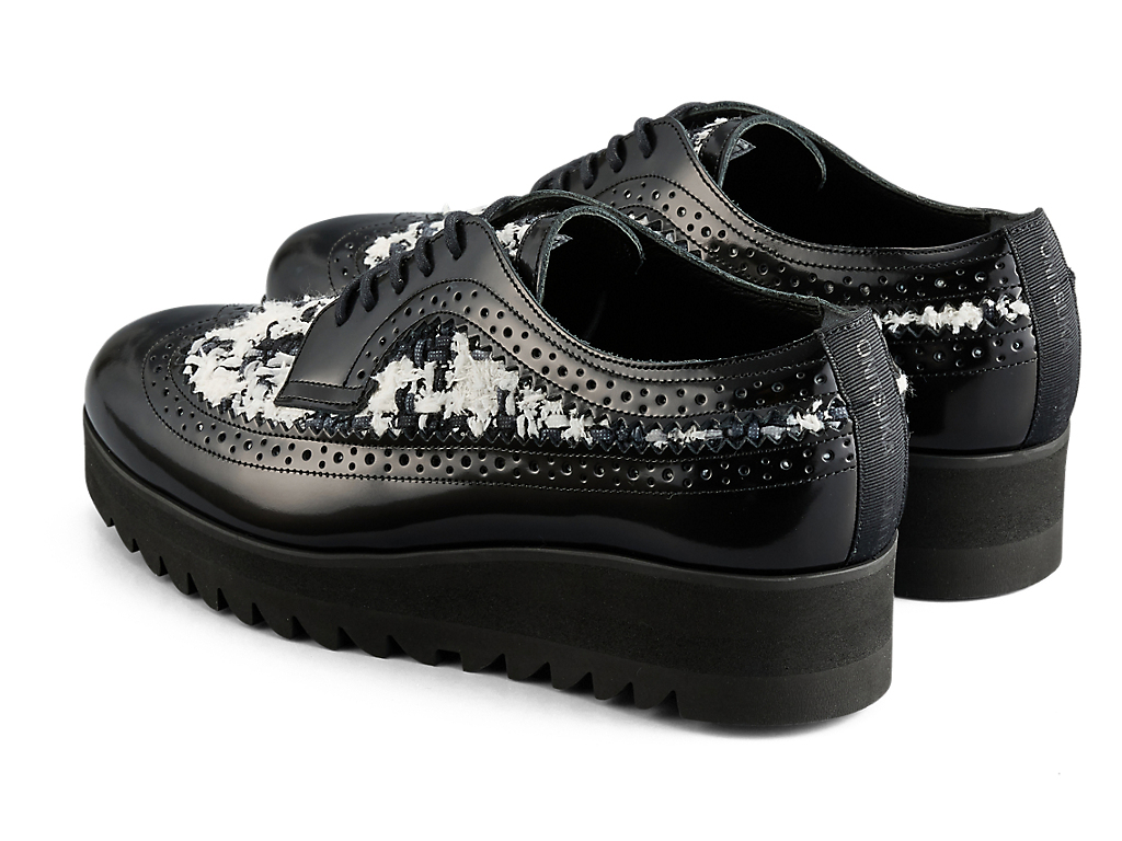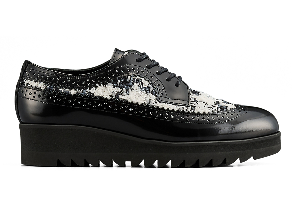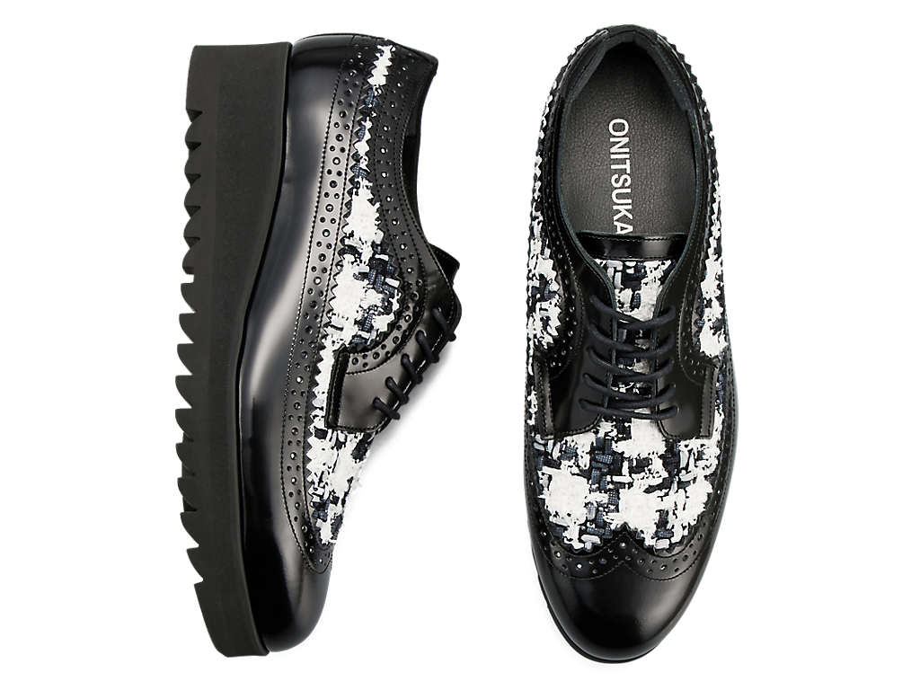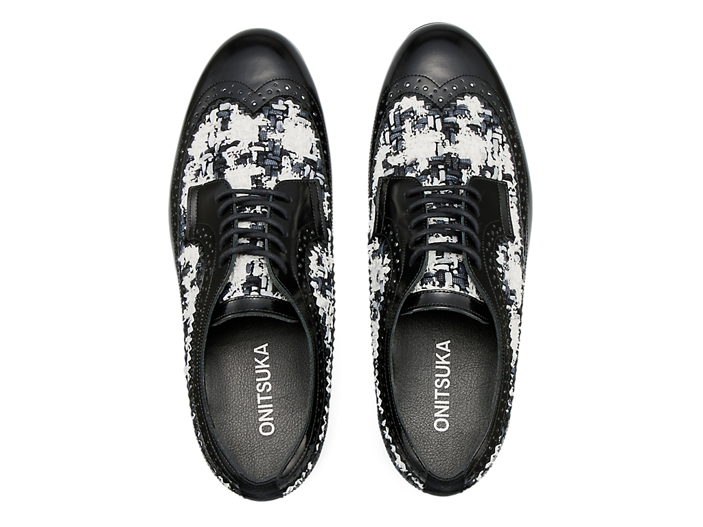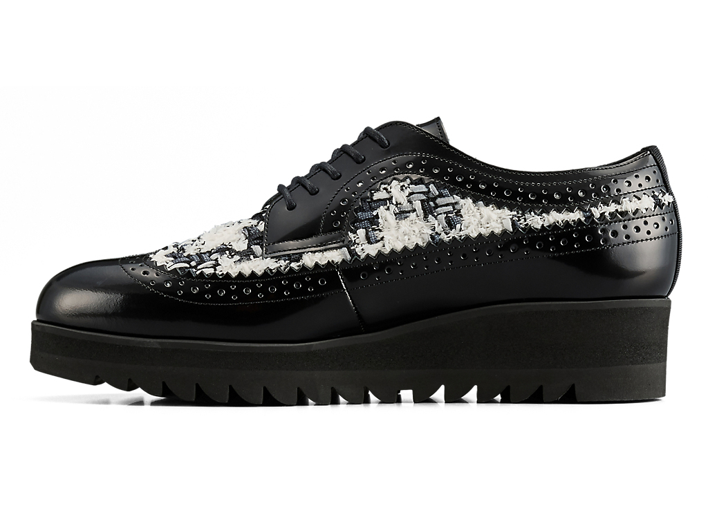 1970年に発売されたゴルフシューズ「EMPEROR」をモチーフにデザインされたブローグシューズ。ウイングチップやパーフォレーションといった伝統的な装飾が施されており、上品さと洗練を兼ね備えています。アッパーには日本の神戸牛レザーを使用し、フラットで光沢感のあるガラスレザーが足元を華やかに演出します。また、岩手県で織られたツイードを取り入れ、太糸や細糸、天然繊維と人工繊維が織り成す立体的なテクスチャーが上品なアクセントを添えます。