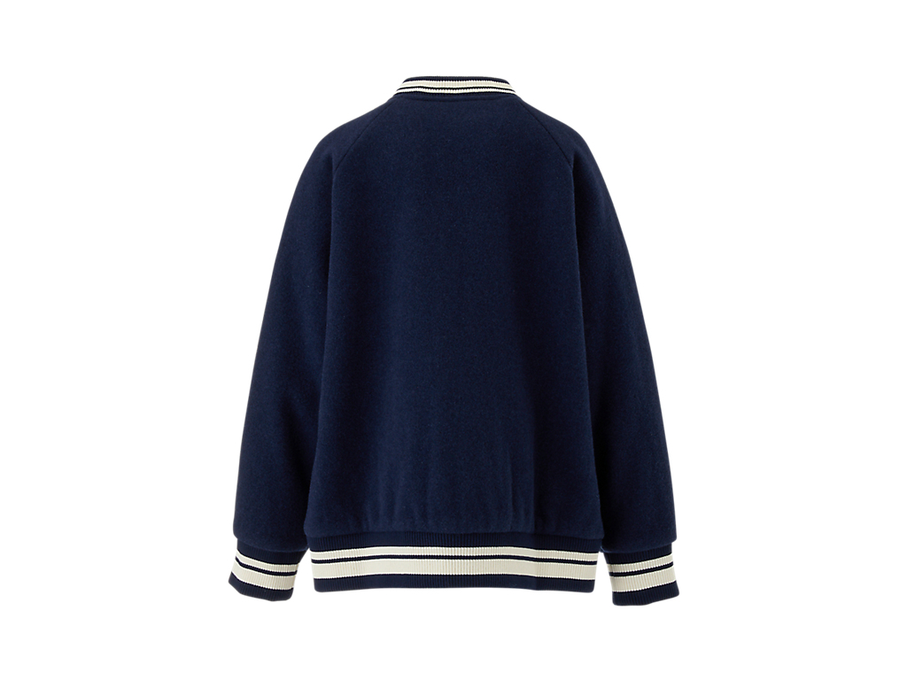 ビンテージライクなメルトンウールを採用したスタジアムジャケット。胸元にあしらわれたロゴパッチは、立体感のある美しいサガラ刺繍で、デザインに高級感を添えます。襟、裾、袖のリブにはオリジナルのストライプで編み立てられたディテールが施され、全体のシルエットを引き締める仕上がりに。さらに、総裏地仕立てで、快適な着心地と保温性を兼ね備えています。セットアップでもコーディネートできるKIDS PANTSも展開。