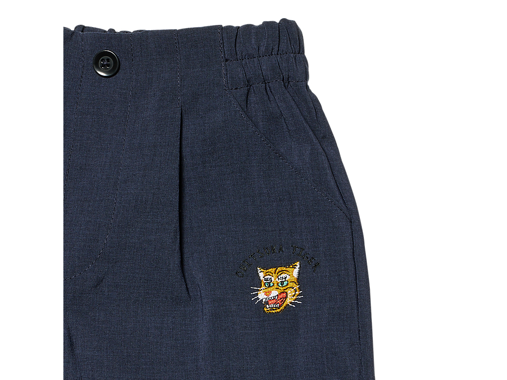 左ポケット下にカラフルな虎の刺繍がワンポイントで施されたデザインで、シンプルなデザインにさりげないアクセントをプラス。
