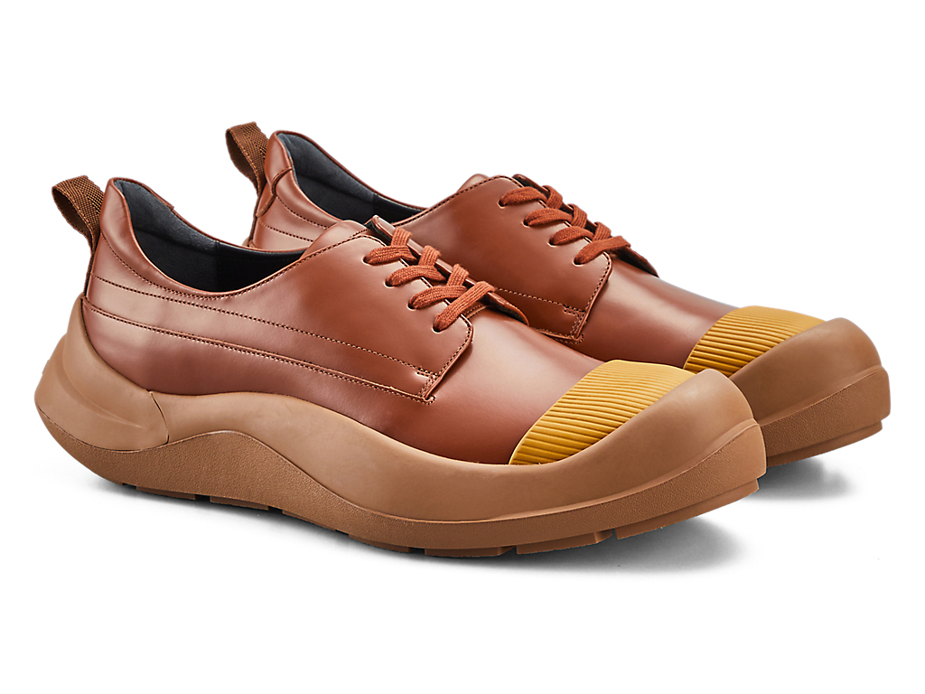 大胆なトゥキャップや、ラギットな印象ながらもほどよいボリューム感のソールと、クラシカルなデザインのアッパーがうまく融合した1足。ソールのクッション感を高めるためにミッドソールにはE.V.A.、かかと部分にはαGEL Foamを搭載している。